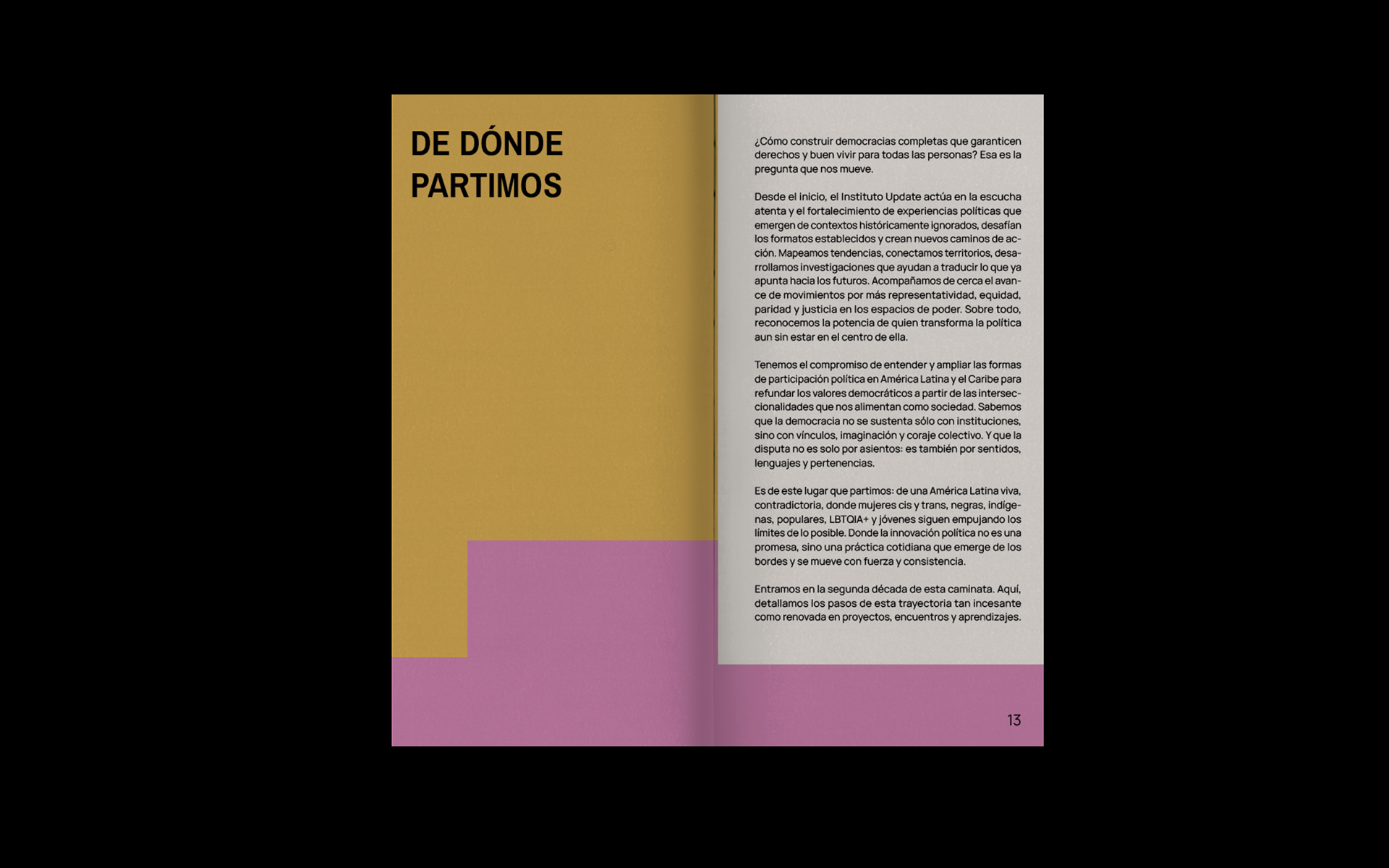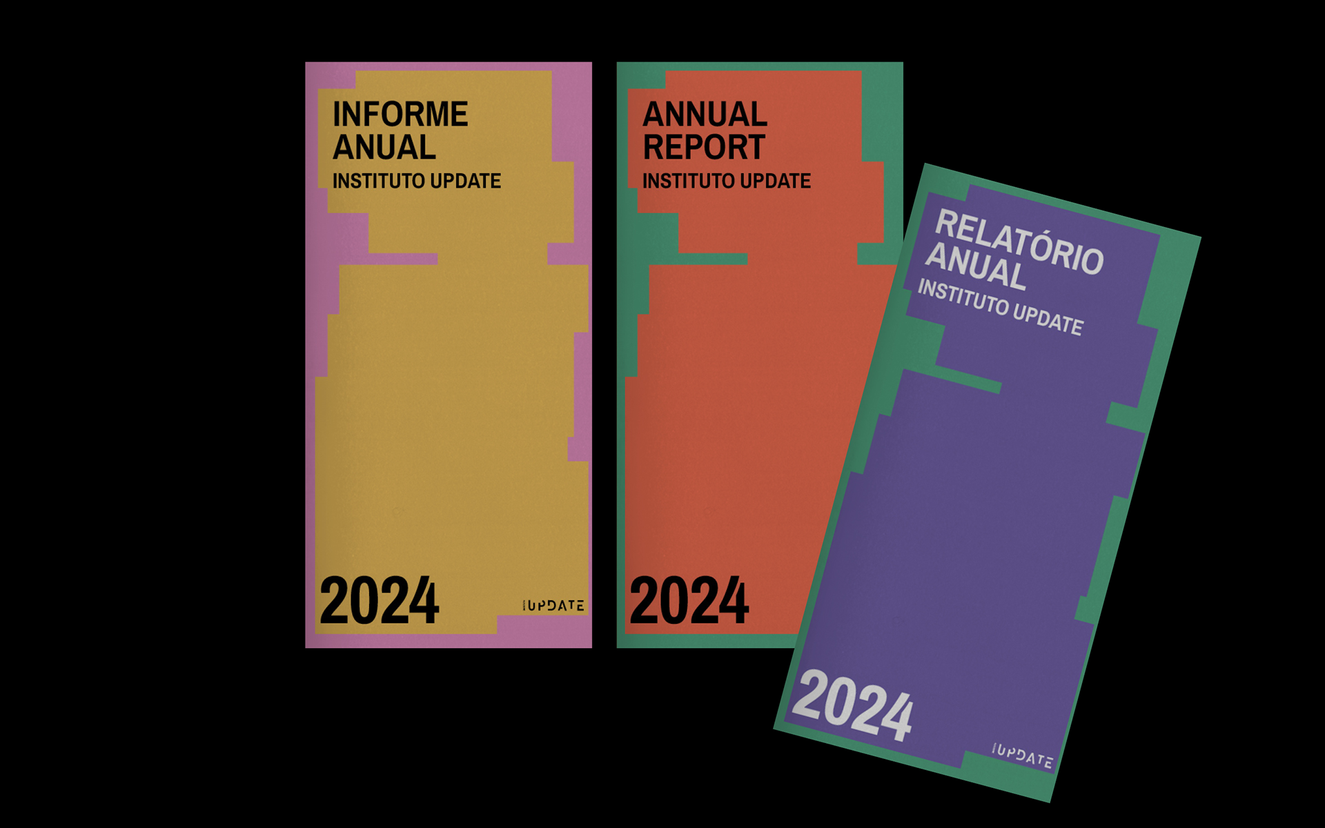 Desenvolvimento do projeto editorial trilingue (Português, Espanhol e Inglês) para o Relatório Anual do Instituto Update, organização dedicada ao fomento de políticas e estudos de inovação democrática na América Latina. O projeto foi concebido para os universos impresso e digital, explorando um formato vertical de 11,5 x 23 cm. A estrutura das páginas duplas evoca a estética e a dinâmica de leitura de um "tabloide", estabelecendo um diálogo visual direto com o caráter documental e informativo da instituição.