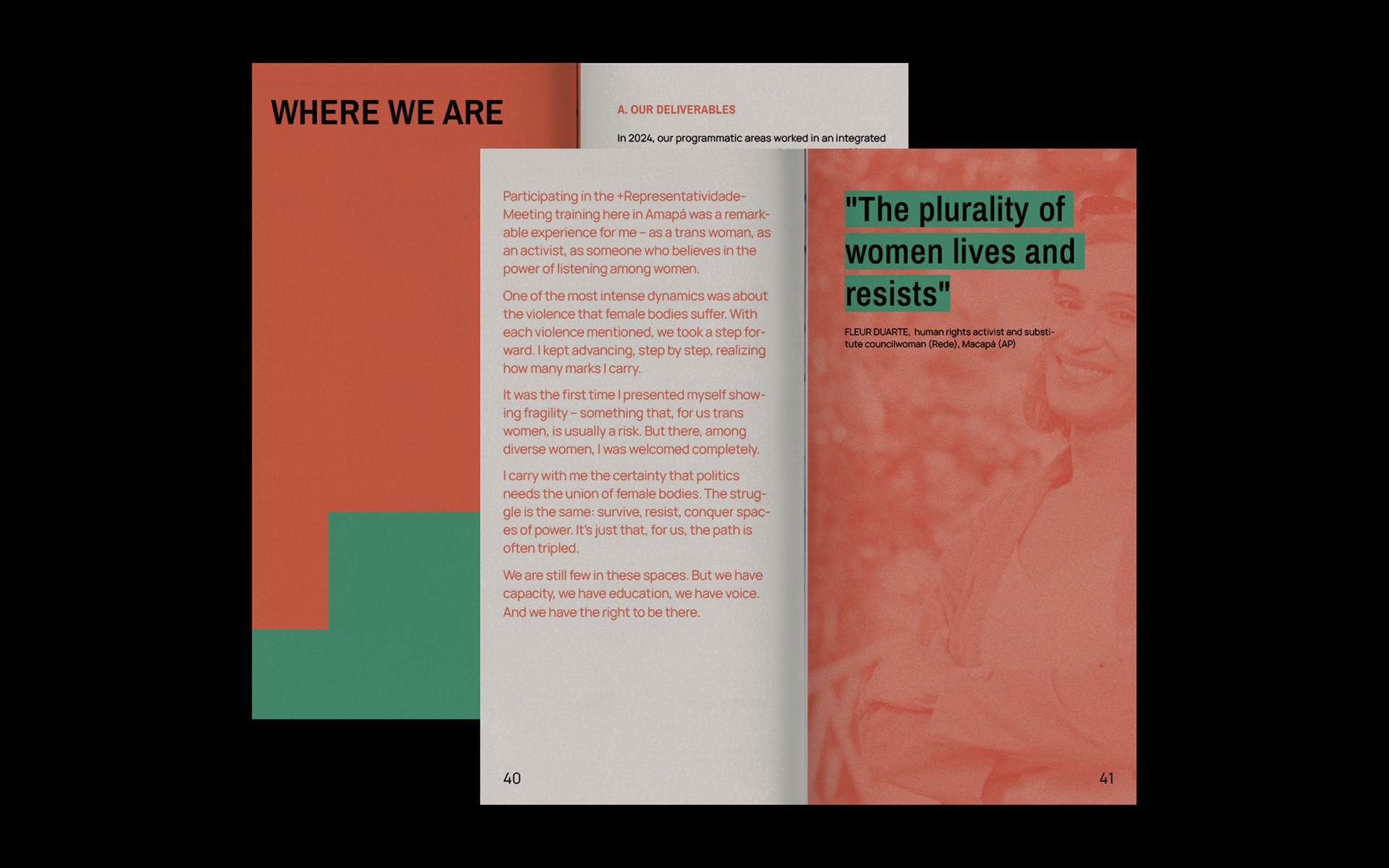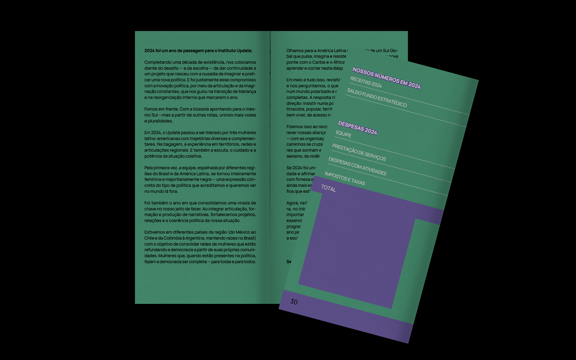 [EN] Development of a trilingual editorial project (Portuguese, Spanish, and English) for the Annual Report of Instituto Update, an organization dedicated to fostering democratic innovation policies and studies in Latin America. Designed for both print and digital mediums, the project features a vertical 11.5 x 23 cm format. The double-page spreads evoke the aesthetics and reading dynamics of a "tabloid," establishing a direct visual dialogue with the institution's documentary and informative nature.