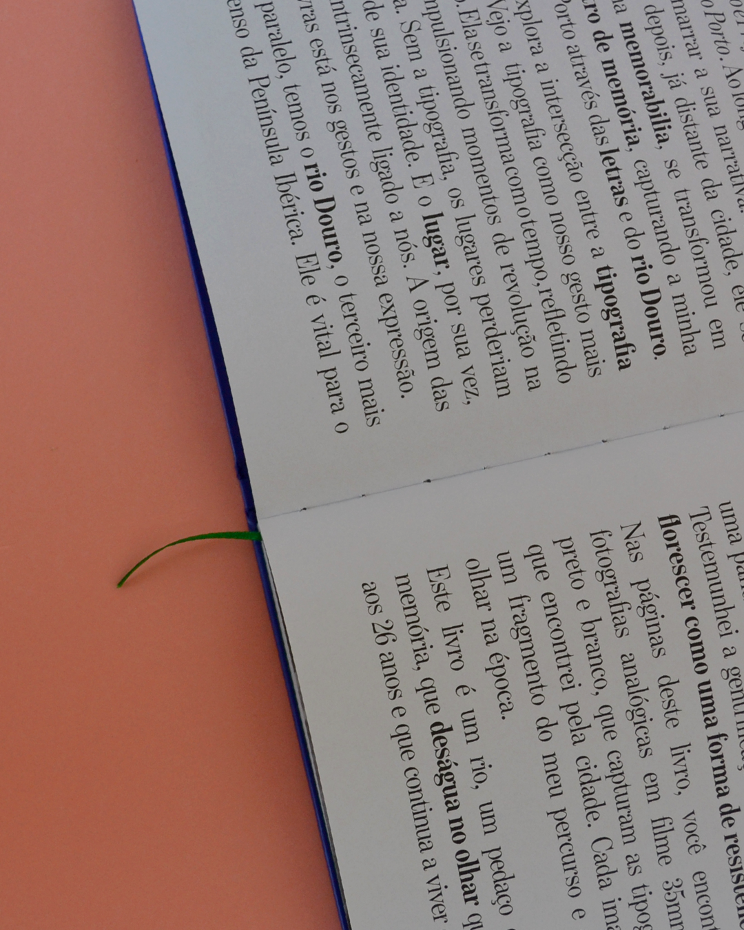 “Ao longo dos anos, revisitei-o, buscando amarrar a sua narrativa. Hoje, quase cinco anos depois, já distante da cidade, ele se tornou uma memorabilia, se transformou em um registro de memória, capturando a minha visão de Porto através das letras e do rio Douro. O livro explora a intersecção entre a tipografia e o rio. Vejo a tipografia como nosso gesto mais humano. Ela se transforma com o tempo, refletindo e até impulsionando momentos de revolução na história(…) Este livro é um rio, um pedaço da minha memória, que deságua no olhar que eu tinha aos 26 anos e que continua a viver em mim.”
