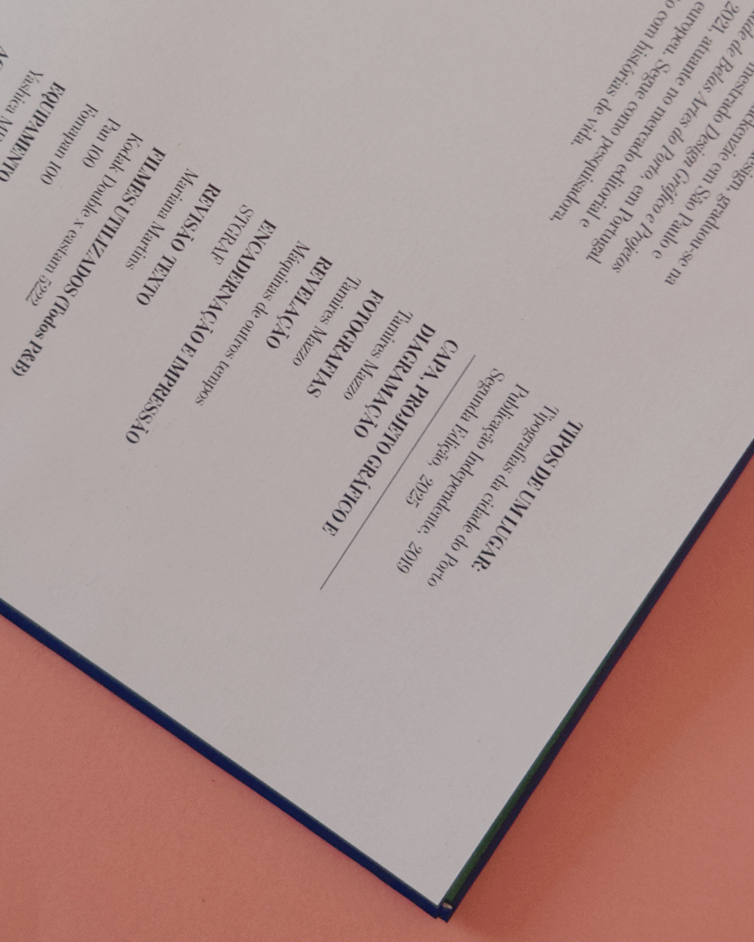 [EN] "Tipos de Um Lugar: Tipografias da Cidade do Porto" is an independent photobook created as part of the author's Master's degree at Belas Artes do Porto. It serves as a sentimental and documentary critique of the gentrification of Porto, seen through the lens of landscape typography (street signs, lettering).The author, who lived in Porto for six years and has a strong, curious connection to letters due to being dyslexic, used 35mm black and white film for all photographs. The book's graphic design is meticulously detailed, featuring hardcover, visible stitching, and debossing. The use of newsprint emphasizes its documentary nature, while a tracing paper belly band and duotone section reference the film negatives and the intersection of change (blue vs. green). The entire project explores how the city's identity changes through its visible typography.
